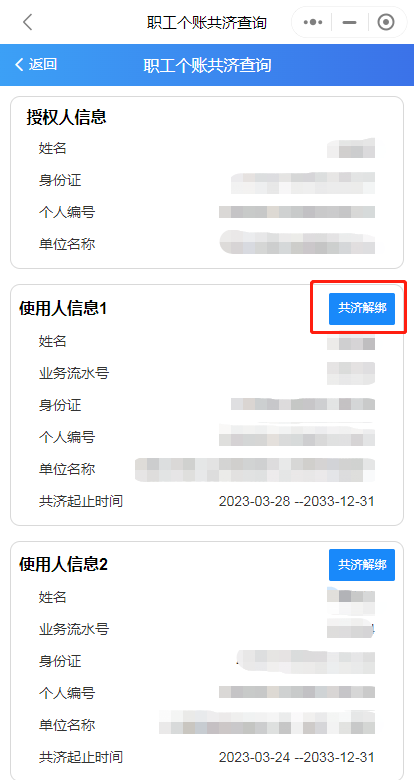 第四步:辦理完成后,可通過(guò)“家庭共濟(jì)”——“共濟(jì)關(guān)系查詢解綁”查詢綁定情況,“解除綁定”功能也可在此界面操作。